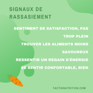 Les signaux peuvent prendre jusqu’à 20 minutes pour se rendre au cerveau, d’où l’importance de manger lentement pour mieux écouter ses signaux de faim et de rassasiement. Pour vous aider à prendre votre temps, vous pouvez utiliser de plus petites assiettes et vous resservir au besoin.
